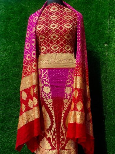 Exclusive Artisan Hand Bandhej Pure Banarasi Georgette Lehenga Set (Neem Zari – 12 Kali Chaniya Choli with Dupatta)