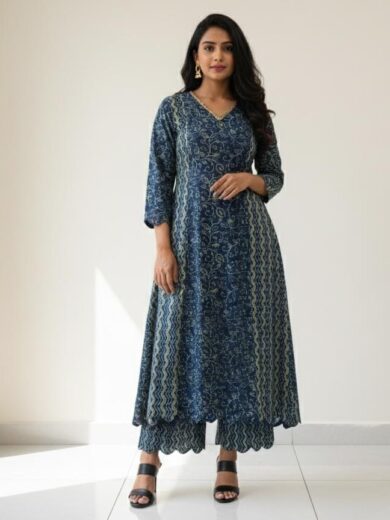 Handblock Cotton Alia-Cut Frock-Style Kurti & Palazzo Set